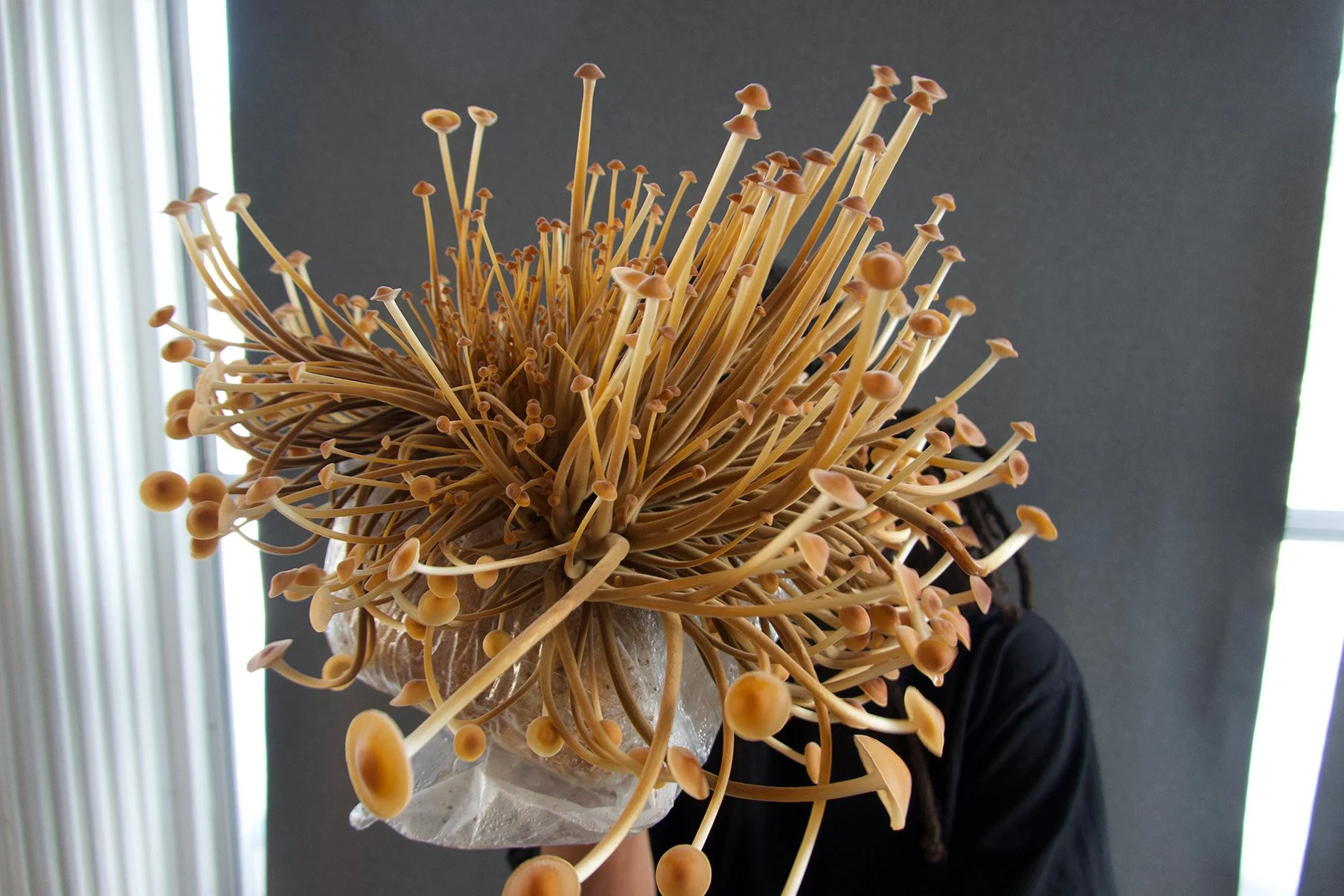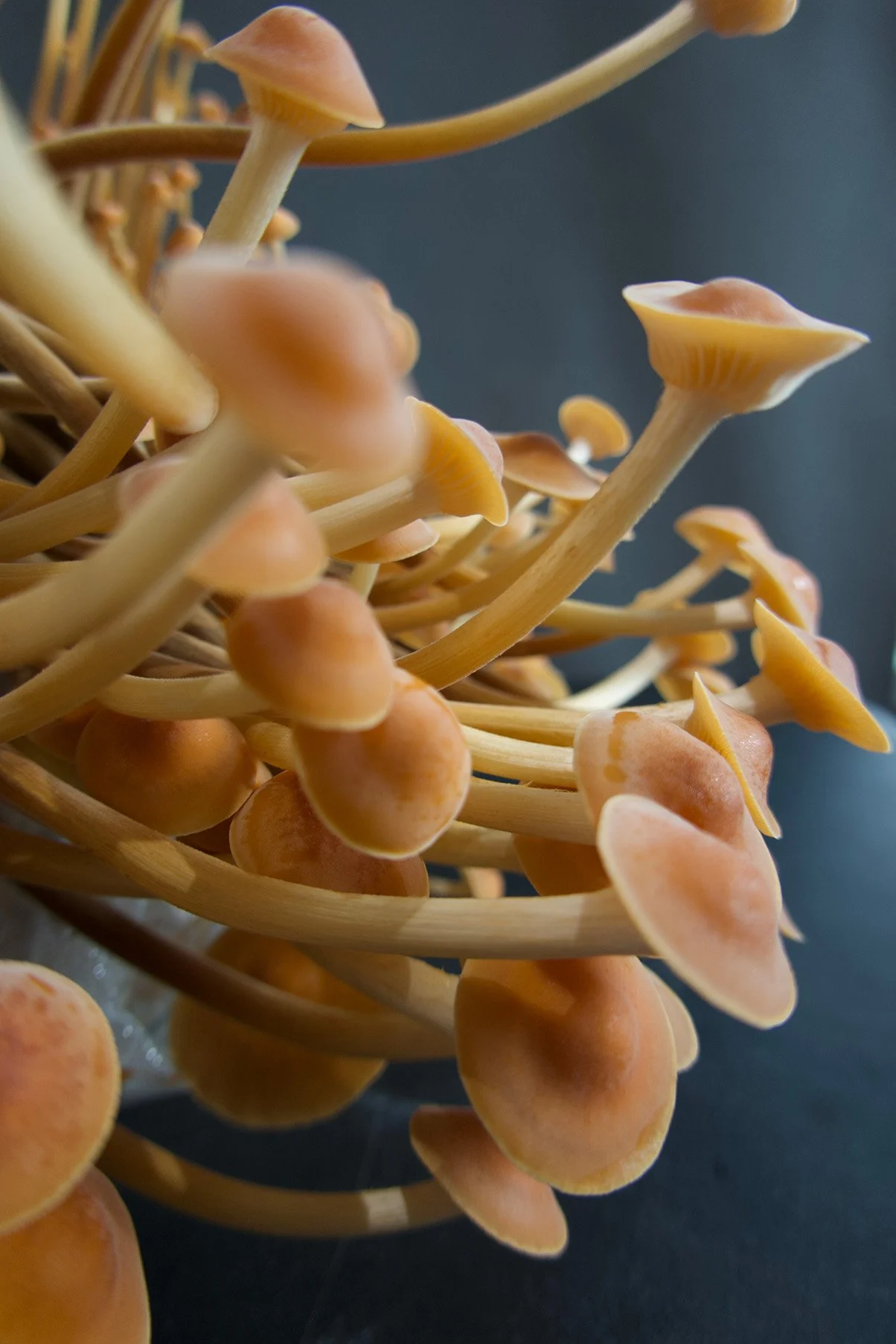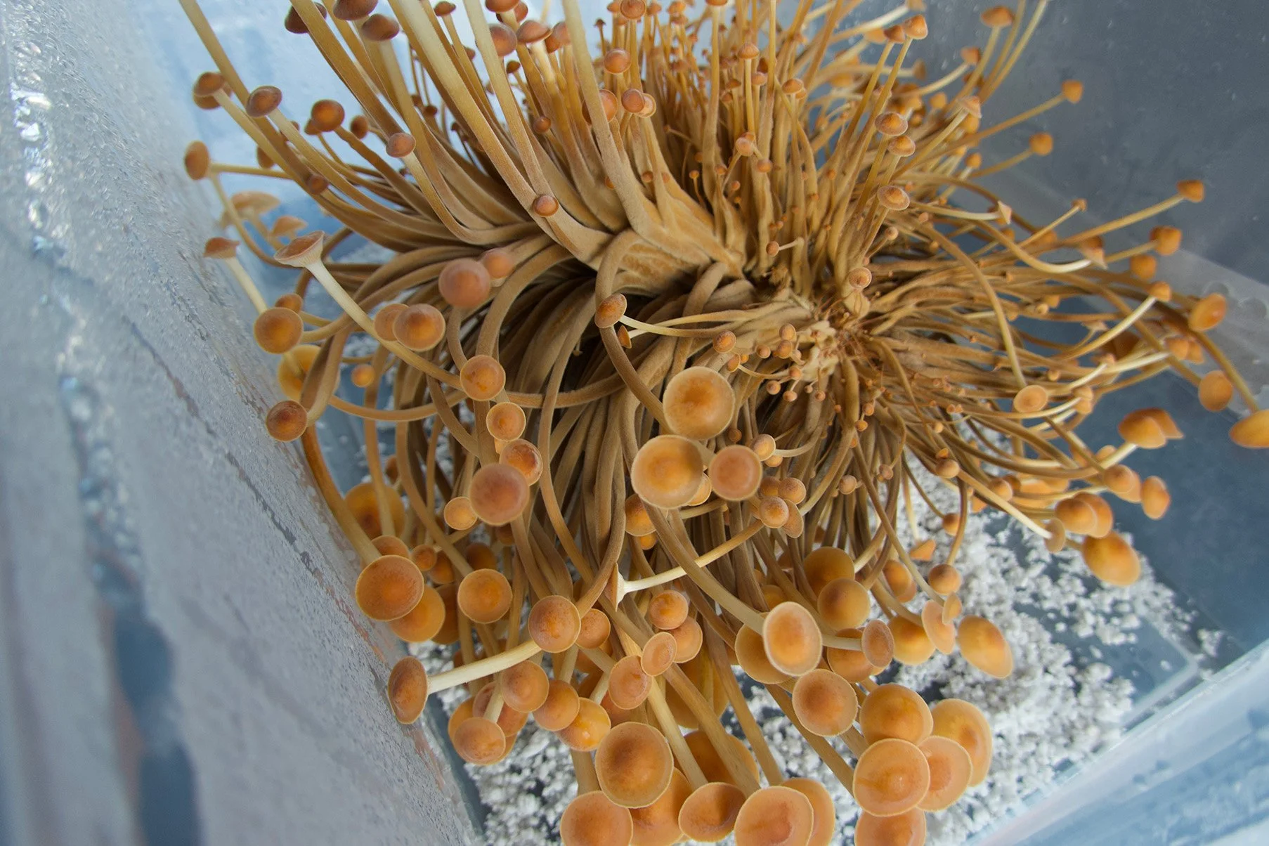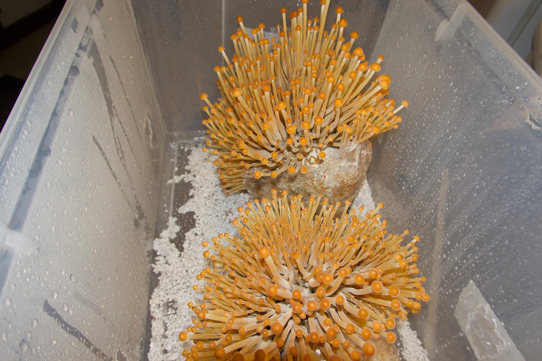 Golden Enoki mushrooms growing in a mono tub.